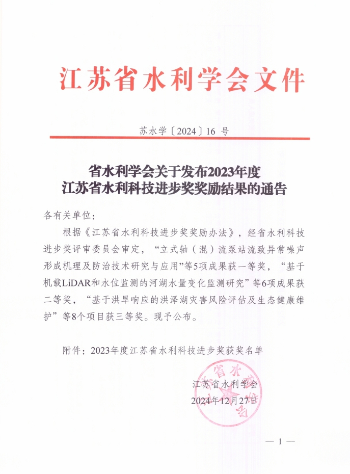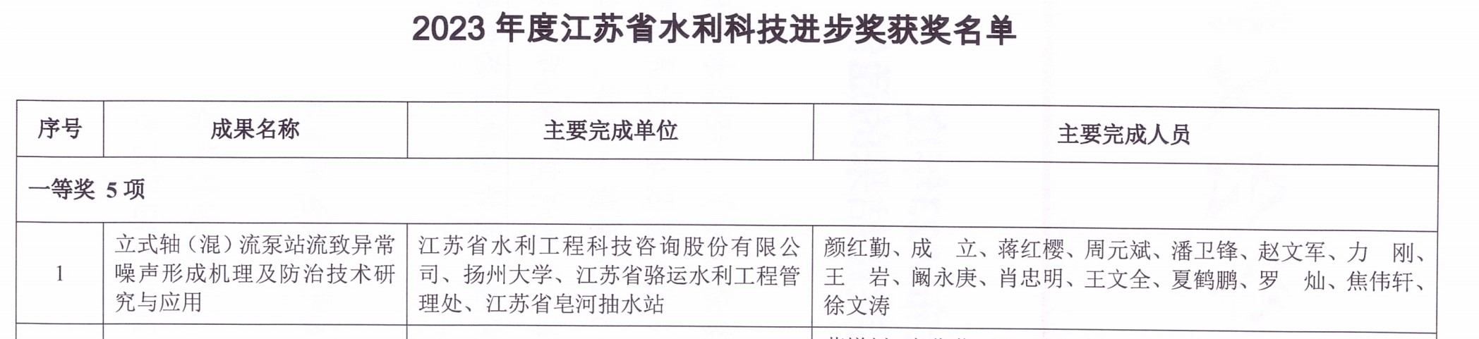 根據(jù)蘇水學(xué)〔2024〕16號《省水利學(xué)會關(guān)于發(fā)布2023年度江蘇省水利科技進步獎獎勵結(jié)果通告》,由我公司主持完成的《立式軸(混)流泵站流致異常噪聲形成機理及防治技術(shù)研究與應(yīng)用》項目喜獲2023年度江蘇省水利科技進步獎一等獎。 本項目采用噪聲分析、功率譜分析、EMD 分解分析等方法,提出了區(qū)別空化噪聲、葉輪旋轉(zhuǎn)噪聲的判別標(biāo)準(zhǔn)。綜合聲學(xué)及水力特性,提出了水泵內(nèi)部采用微導(dǎo)流條的優(yōu)化措施,達到降低流致異常噪聲的效果。項目采用計算流體力學(xué)技術(shù)(CFD)、計算聲學(xué)技術(shù)(CA)以及模型試驗等融合手段,提出了采用本征模函數(shù),實現(xiàn)了空化噪聲、葉輪旋轉(zhuǎn)噪聲的判別。研發(fā)了水下噪聲測量裝置,可實現(xiàn)對水泵噪聲的實時監(jiān)測和分析。 項目成果已應(yīng)用于諫壁抽水站、九曲河泵站、皂河抽水站、沙集閘站等項目,效果良好,可為類似泵站工程建設(shè)、改造與運行管理提供借鑒,具有良好的推廣應(yīng)用價值。  (供稿:研發(fā)中心 夏鶴鵬)