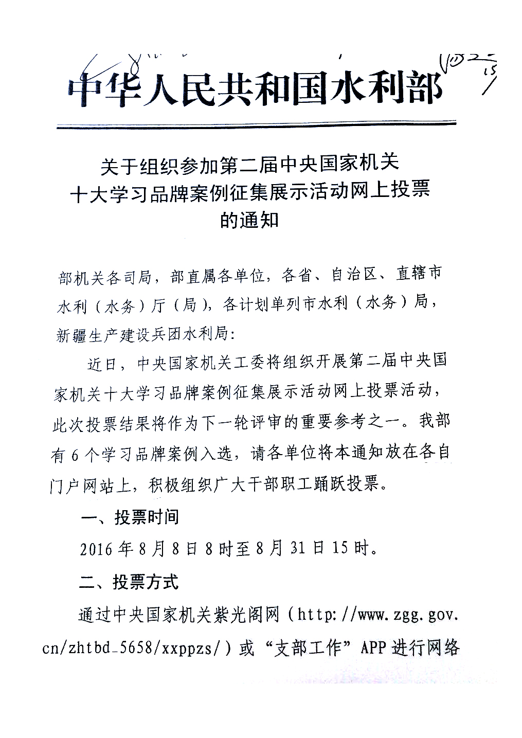 關(guān)于組織參加第二屆中央國家機關(guān)十大學(xué)習(xí)品牌案例征集展示活動網(wǎng)上投票的通知