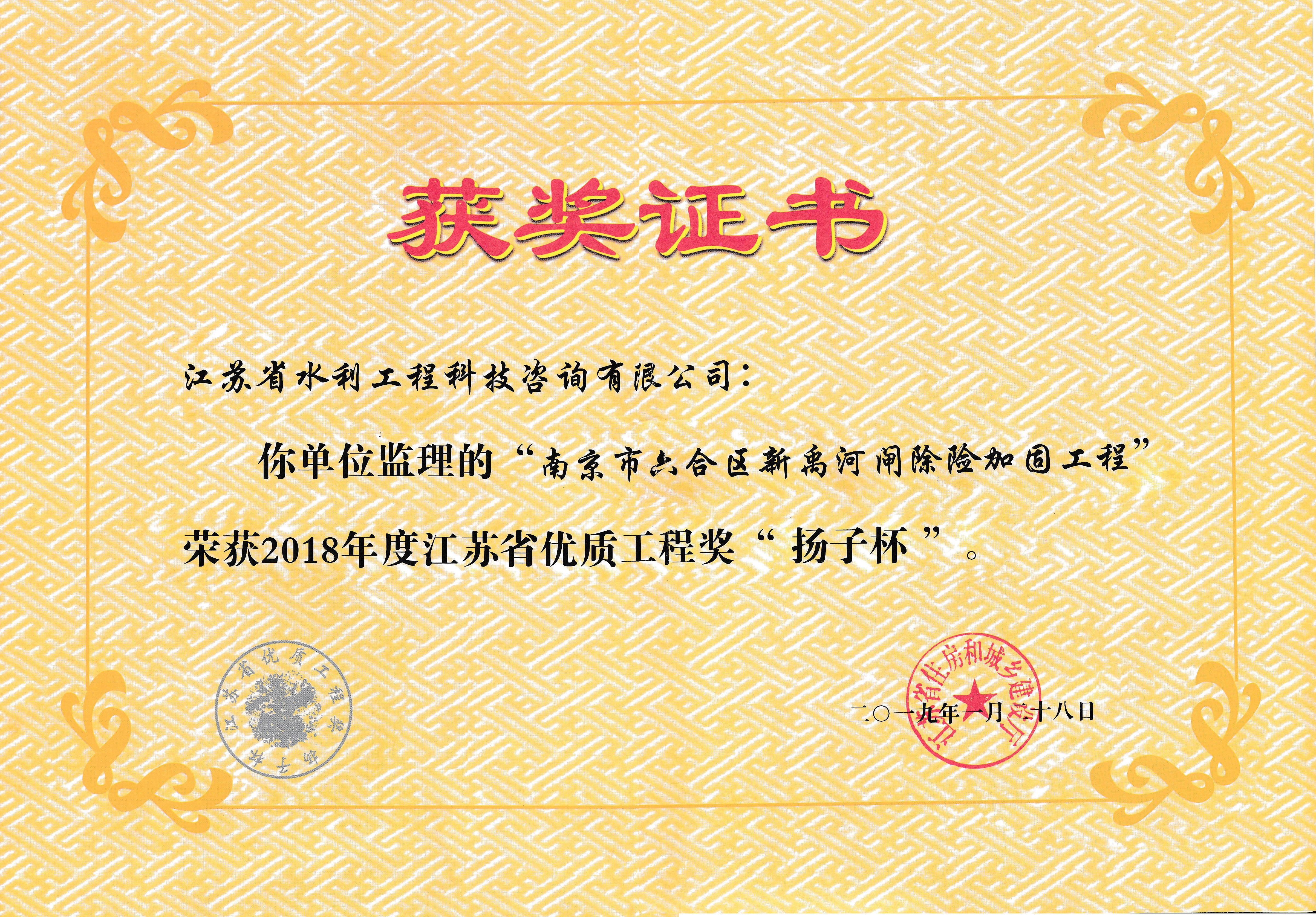 江蘇省住房和城鄉(xiāng)建設(shè)廳于2019年1月28日以《省住房城鄉(xiāng)建設(shè)廳關(guān)于公布2018年度江蘇省優(yōu)質(zhì)工程獎(jiǎng)“揚(yáng)子杯”獲獎(jiǎng)項(xiàng)目名單的通知》(蘇建質(zhì)安〔2019〕39號(hào)),確認(rèn)我公司參建的南京市六合區(qū)新禹河閘榮獲2018年度江蘇省工優(yōu)質(zhì)工程獎(jiǎng)“揚(yáng)子杯”。 新禹河閘除險(xiǎn)加固工程位于六合區(qū)新禹河入滁河口1.1千米處,主要功能是排洪、引水和蓄水灌溉。主要建設(shè)內(nèi)容為:拆除老河閘及連接線堤防,新建閘室、站身,配套閘門、啟閉機(jī)及電氣設(shè)備,新建啟閉機(jī)房等;采用閘站結(jié)合形式新建新禹河閘和補(bǔ)水泵站。新禹河閘主要建筑物級(jí)別2級(jí),設(shè)計(jì)行洪流量403立方米/秒,補(bǔ)水泵站設(shè)計(jì)流量10立方米/秒。通過新禹河閘除險(xiǎn)加固工程建設(shè),增加河道泄洪能力和翻引長(zhǎng)江水功能,消除安全隱患,保證工程安全運(yùn)行,行洪標(biāo)準(zhǔn)20年一遇。 工程于2015年10月9日開工,2017年1月20日通過竣工驗(yàn)收,質(zhì)量等級(jí)為優(yōu)良。