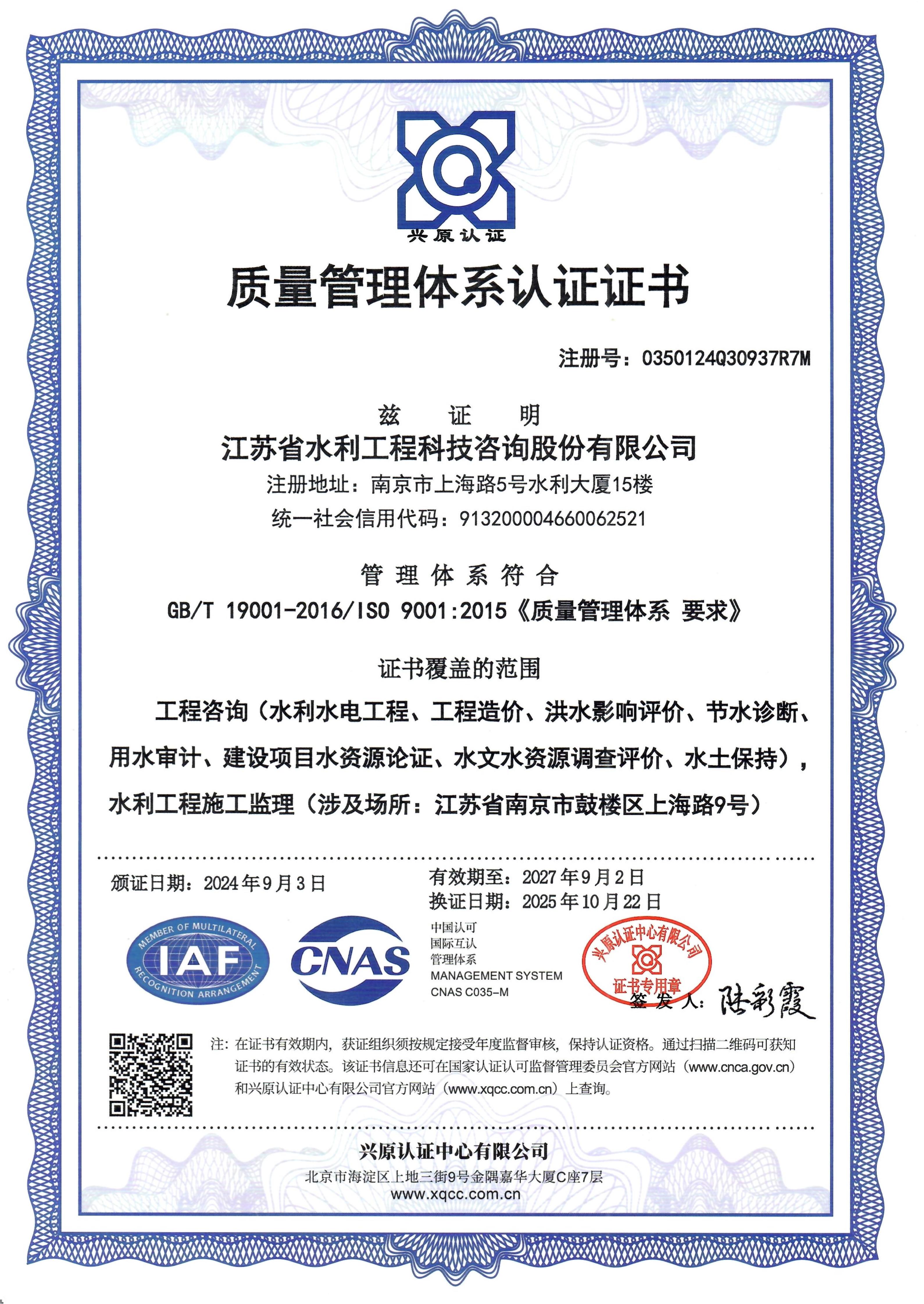 > ISO質量管理體系認證證書