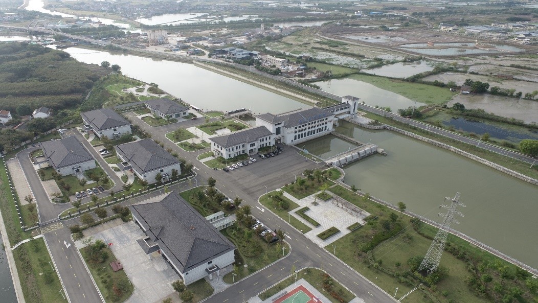常州市金壇區(qū)龍山水利樞紐工程位于通勝地區(qū)通濟河下游南支出口老丹金溧槽河南端上,距離航道改道河口600米處,樞紐由泵站和節(jié)制閘組成。泵站設(shè)計排澇流量70m3/s,裝機5臺套豎井貫流泵,其中3臺單向泵、2臺雙向泵,單機流量14m3/s,配10kV異步電動機,單向、雙向水泵單機功率分別為400kW、500kW,總裝機容量2200kW。節(jié)制閘凈寬24m,共2孔,每孔凈寬12m,閘室采用開敞式鋼筋混凝土整體塢式結(jié)構(gòu)。
